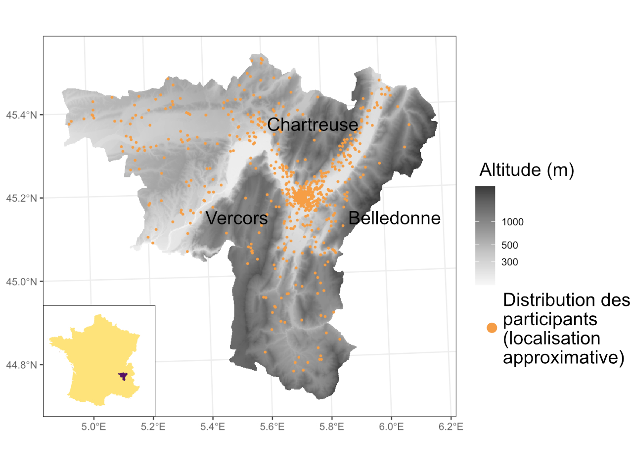 - Beaucoup de participants vivent dans la métropole de Grenoble, mais environ 53 % vivent dans les zones rurales ou de montagne. Une proportion élevée des participants à l’enquête pratique la chasse, reflétant une forte implication de la fédération de chasse dans sa diffusion ; leurs réponses ont été pondérées dans la suite des résultats pour maintenir une représentativité avec la population du territoire.