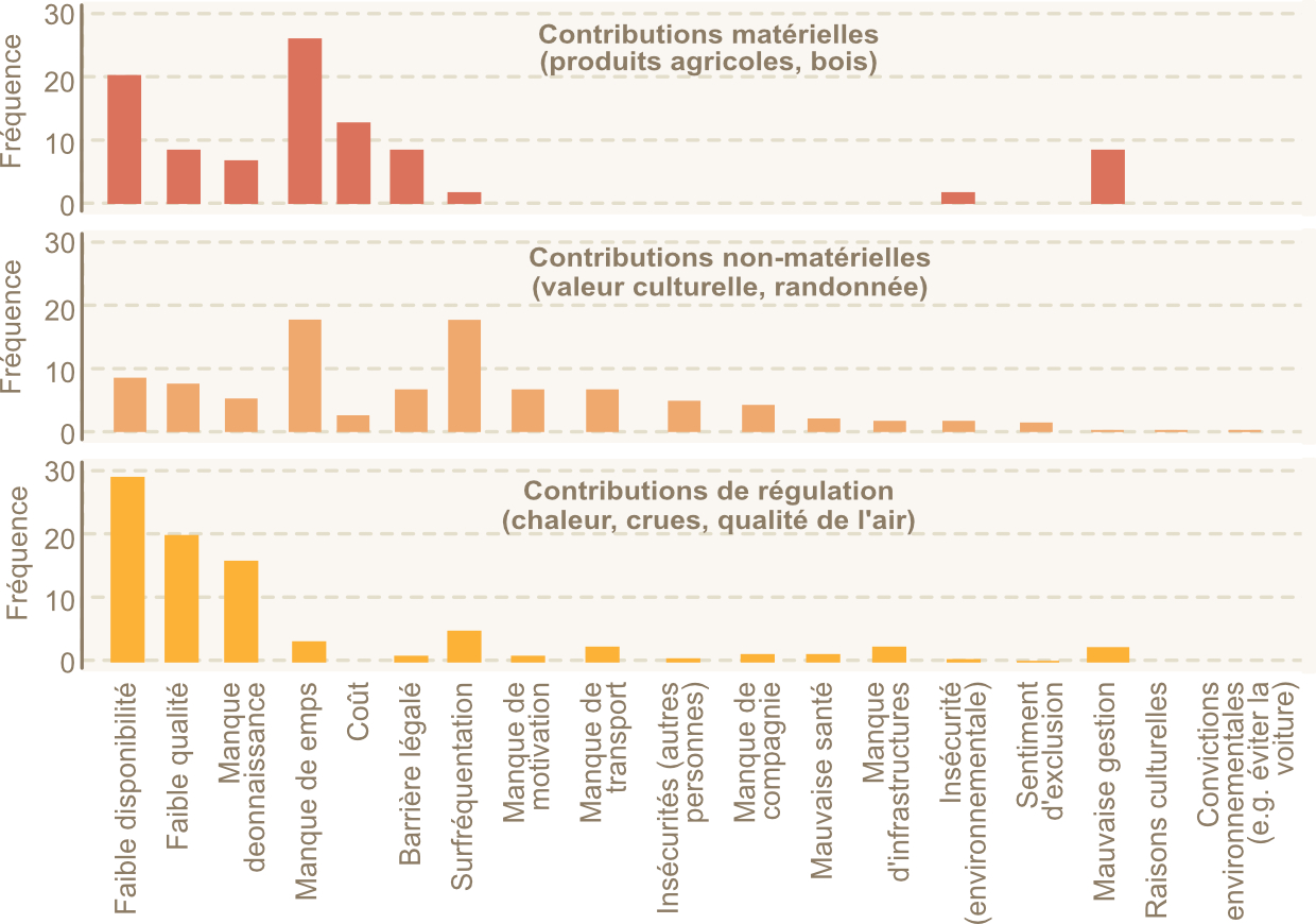 Les barrières les plus fréquemment mentionnées dépendent du type de contribution. L'accès aux contributions non-matérielles (valeur culturelle, loisirs en plein air) est principalement limité par le manque de temps et la sur-fréquentation des espaces naturels. Les contraintes perçues concernant les contributions matérielles (accès au bois et produits agricoles locaux) concernent principalement le manque d'espaces producteurs et de temps. Enfin, les contributions liées à la régulation des risques tels que la température, les crues, ou de la qualité de l'eau sont majoritairement limitées par la disponibilité et la qualité des espaces verts et naturels, ainsi que par un déficit de connaissances sur les lieux fournissant ces fonctions.