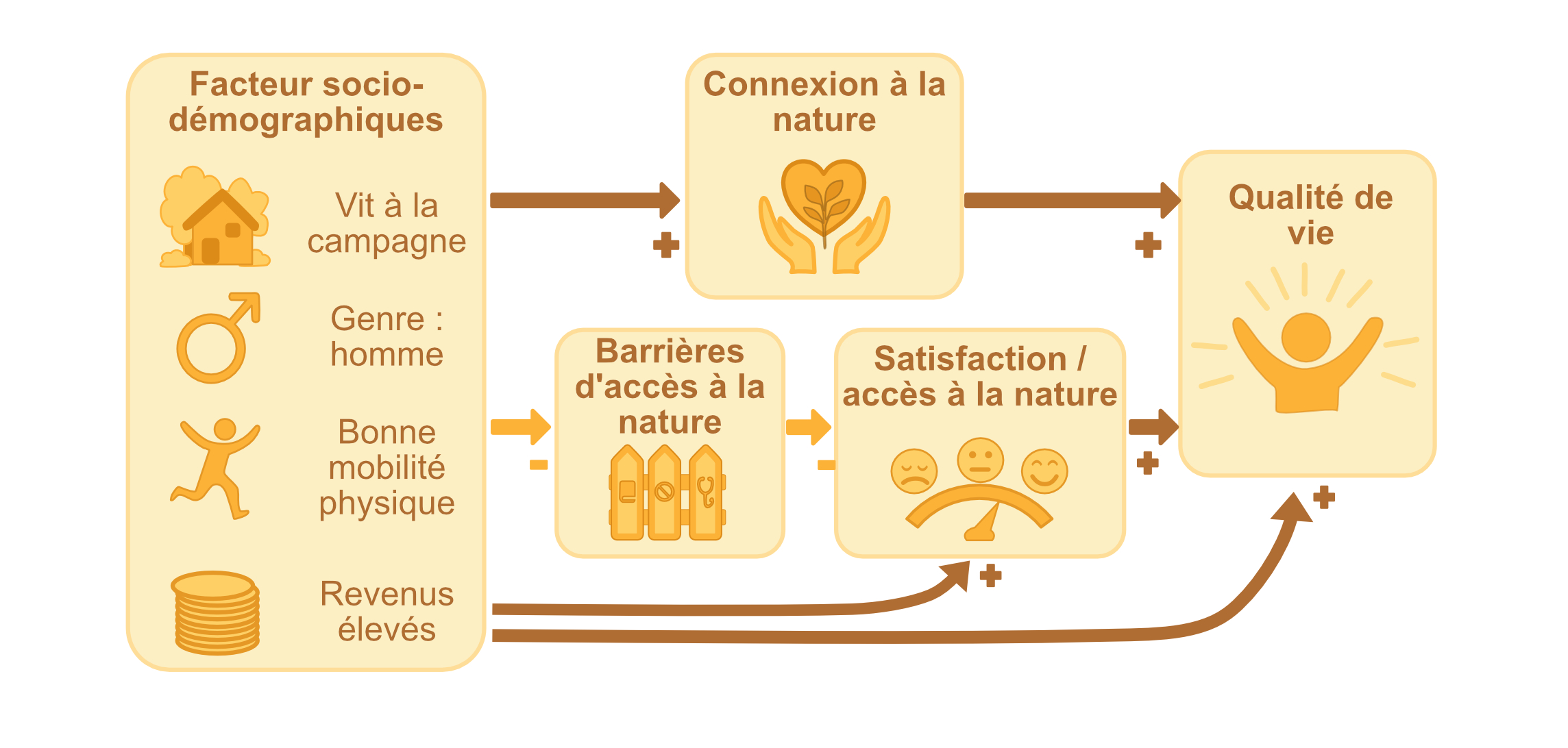 La nature contribue à notre qualité de vie de multiples façons, qu’il s’agisse de la production de ressources (bois, alimentation), de la régulation des températures, ou encore d’activités récréatives telles que les promenades en parcs ou en montagne. Toutefois, ces contributions de la nature ne bénéficient pas de manière équitable à l’ensemble de la population. Différentes barrières peuvent en restreindre l’accès : physiques (qualité insuffisante des espaces verts, accès ou transports limités), légales (propriété privée), ou encore sociales et individuelles (sentiment d’insécurité, manque de temps, isolement social). Dans un contexte de déconnexion croissante envers la nature, ces obstacles risquent d’accentuer les difficultés d’accès pour certains groupes, avec des répercussions sur leur qualité de vie et un renforcement des inégalités sociales. Comprendre ces barrières selon les groupes sociaux, ainsi que leurs effets sur la connexion à la nature (le sentiment d'appartenance et de proximité avec le monde naturel qui nous entoure) et la qualité de vie, constitue ainsi un levier essentiel pour orienter les actions visant à garantir un accès équitable aux espaces verts et naturels. Ces questions ont été adressées dans le cadre de l'enquête menée en 2024.