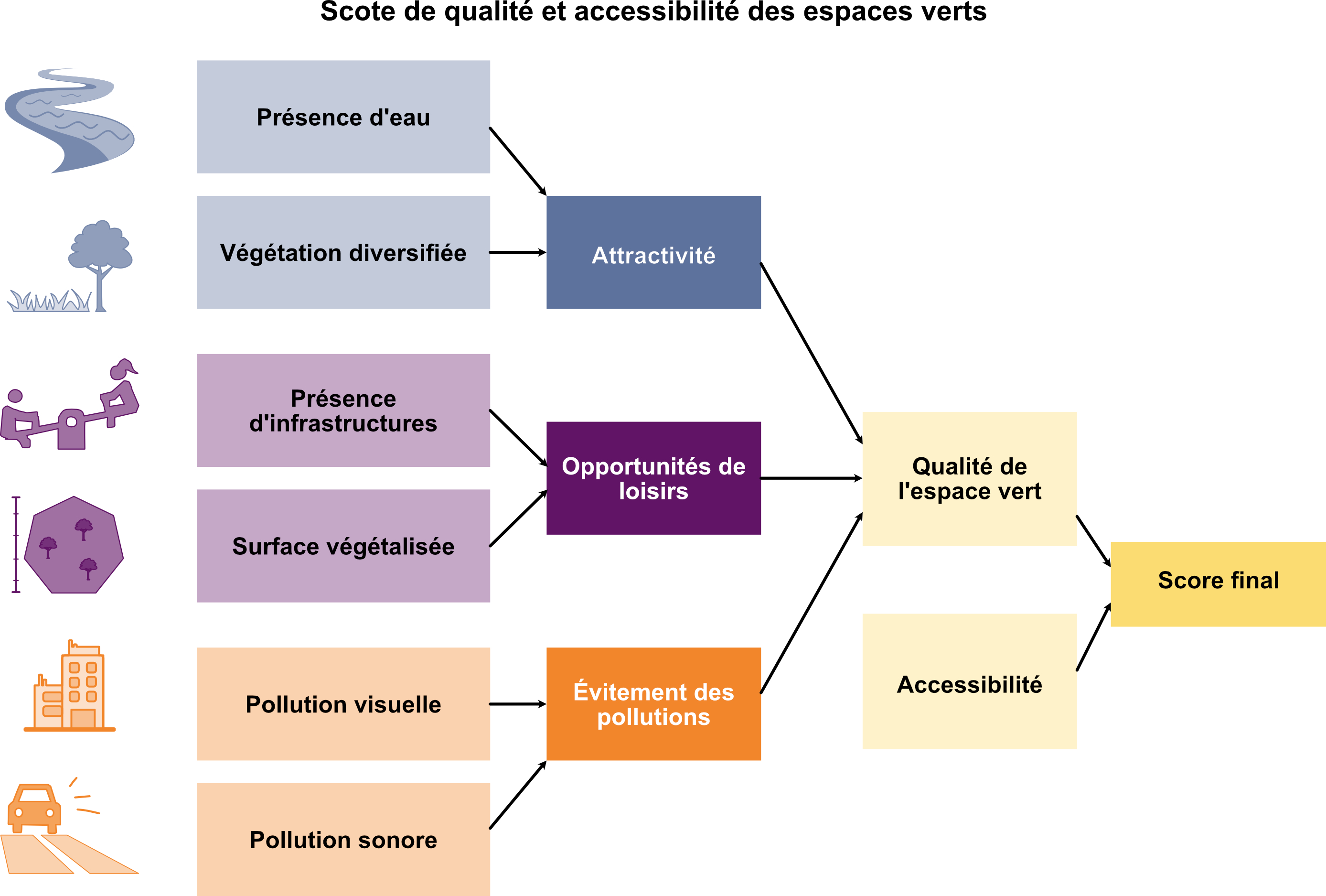 Dans cette étude, nous avons combiné des données spatiales socio-démographiques avec une modélisation spatiale des contributions de la nature afin d’examiner les inégalités dans la distribution de trois contributions clé - l’atténuation des vagues de chaleur, la régulation des inondations et les loisirs urbains - dans la métropole grenobloise. Pour le service de loisirs urbains, nous avons développé un nouvel indice combinant la qualité et l’accessibilité des espaces verts urbains.